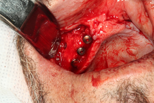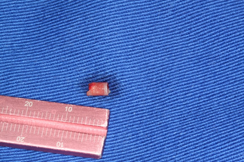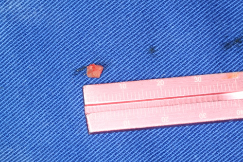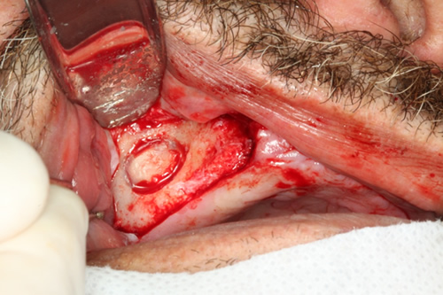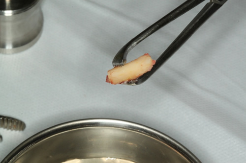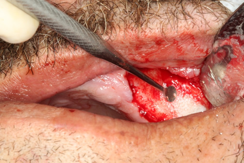 | Remoção de fragmento para análise histopatológica com broca trefina 2 e implantação no lado direito | Retalho para implantação, e remoção de fragmento para análise |