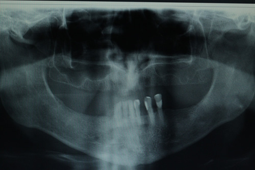 | Inicial: Extensa área de seios maxilares, com atrofia completa da maxila | 6 meses após: Apresenta material radiopaco compatível com enxerto ósseo em quantidade suficiente para implantação |