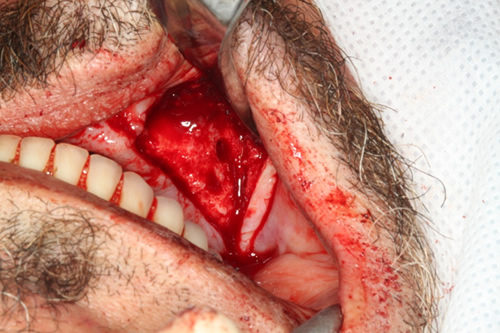 | Acesso ao espaço do seio maxilar direito | Fragmento ósseo a ser particulado e enxertado no seio maxilar direito |